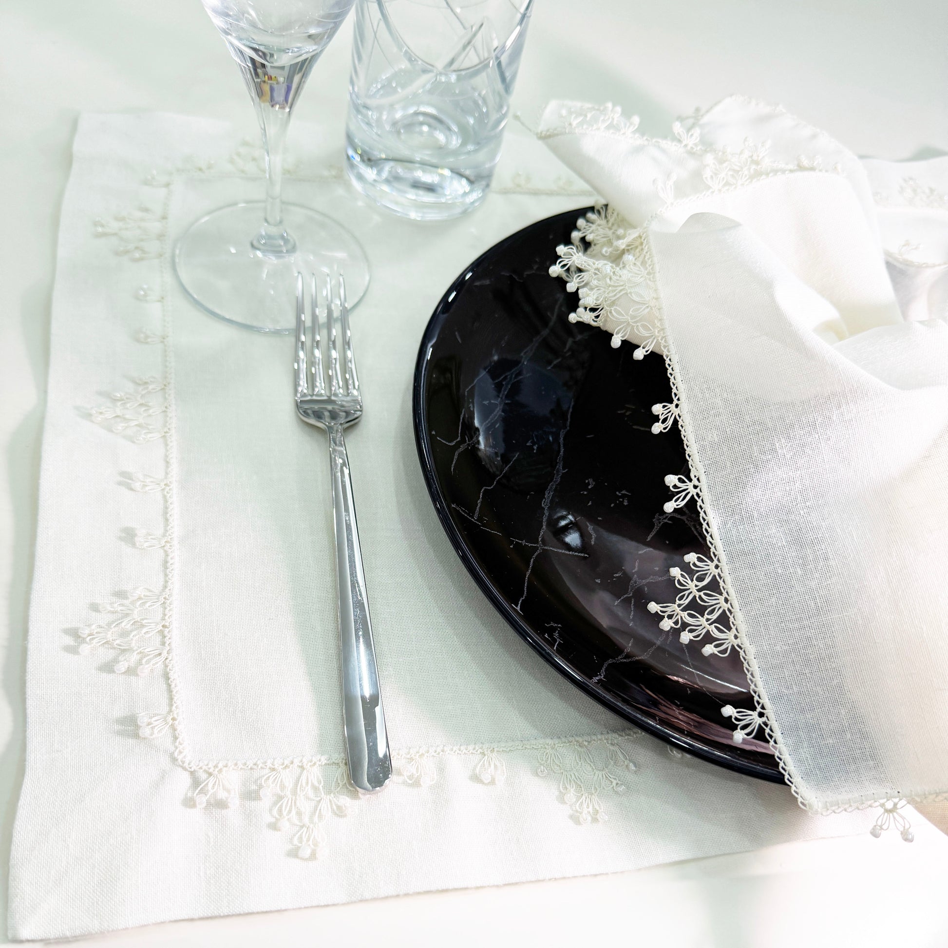 Crafted from fine linen, this collection celebrates the artistry of traditional Anatolian needle lace, delicately accented with transparent beads for a luminous sparkle. Each piece is handcrafted by skilled women artisans, merging heritage techniques with modern sensibility. Designed to elevate any table setting, these placemats embody timeless sophistication—perfect for festive New Year’s Eve celebrations, intimate dinners, or everyday gatherings where elegance and refinement are cherished.