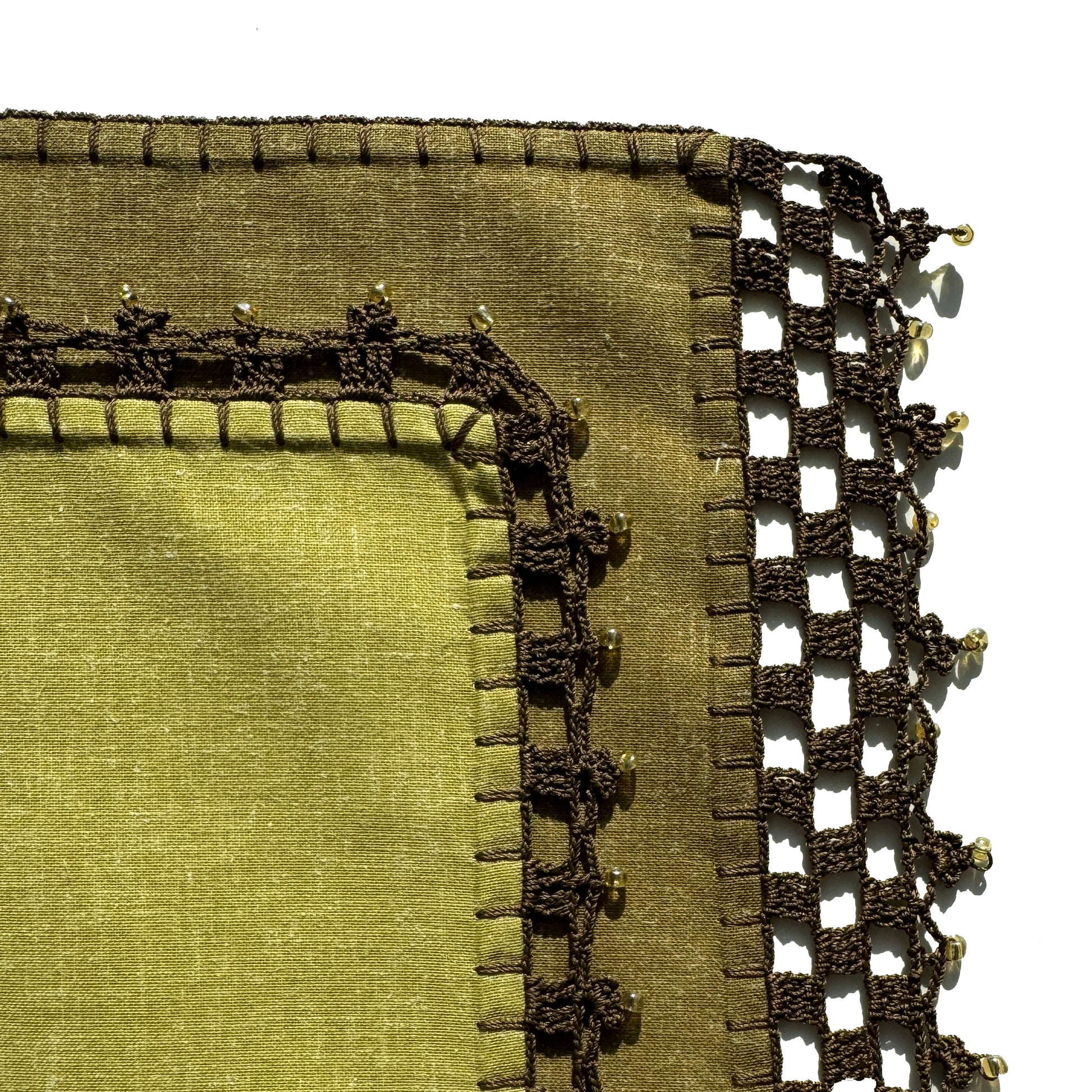 This collection celebrates earthy elegance with fine linen in a rich green hue, beautifully finished with hand-crocheted edging and delicate transparent beads for a luminous touch. Each piece, handcrafted by skilled women artisans, brings timeless sophistication to any table—perfect for celebrations, intimate dinners, or everyday gatherings.